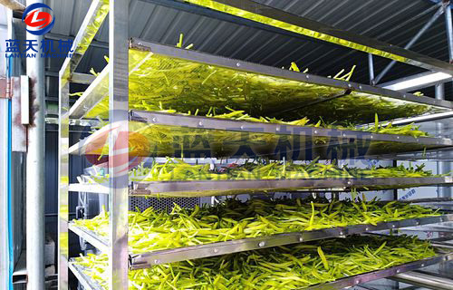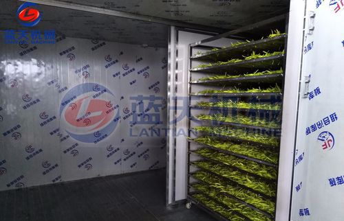 先把黃花菜均勻的攤放在推車托盤上,推車托盤最要用不銹鋼制作的,有利于加快干燥的時(shí)間。每層大約攤放7公分厚。層與層之間要預(yù)留8公分的距離,確保每層的通風(fēng)效果。一部推車最好不要超過(guò)15層。裝好后放在烘干房?jī)?nèi)。
