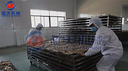 傳統的干燥方法是選擇晴朗的天氣利用太陽曬干,采用吊曬方法時,將魷魚用竹簽撐開,用小鐵鉤住魷魚尾部掛在固定的支架上,魚頭朝下,以便體內水分滲出,魷魚半干時,要進行檢查,看到沒固定好的,用竹簽重新穿刺撐開定型后再曬。采用網曬方法時,將魷魚平鋪擺放在網片上,先曬魚背,后曬魚腹,魷魚半干時整形,拉伸肉面及肉腕,使之平展對稱。1天要翻動5次。吊曬或網曬方法,要曬制6-10天,時間很長、受蠅蟲污染比較嚴重。本文介紹魷魚烘干機墨魚烘干機干燥工藝及注意事項。