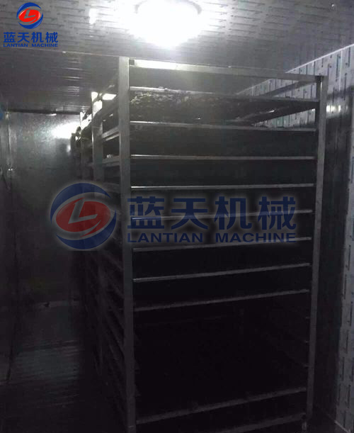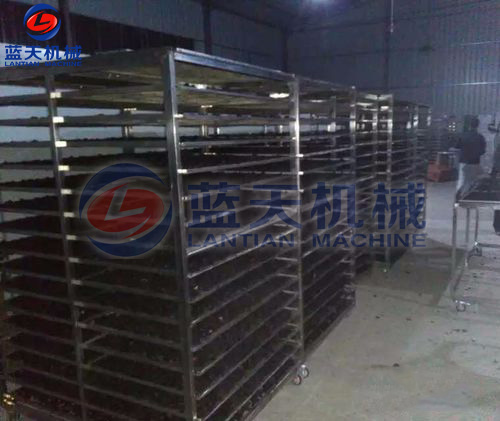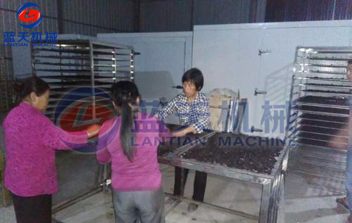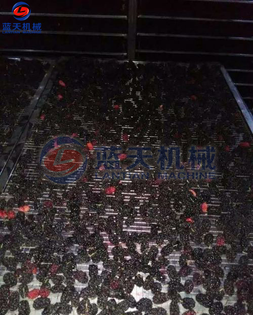 桑葚裝盤:使用桑葚烘干機干燥處理,時間要18個小時就可以干燥處理完了。一般每4公斤鮮桑葚可制成1公斤桑葚干。將經(jīng)整理去雜后的桑葚裝篩子,裝入物料車內(nèi)。每臺物料車不宜超過14個篩子,篩子層間距控制在10公分左右。以10P機為例,不要超過10臺物料車,以保證烘干房內(nèi)有合理間隙位,利于熱風通過。