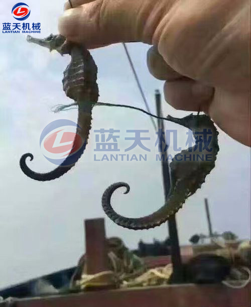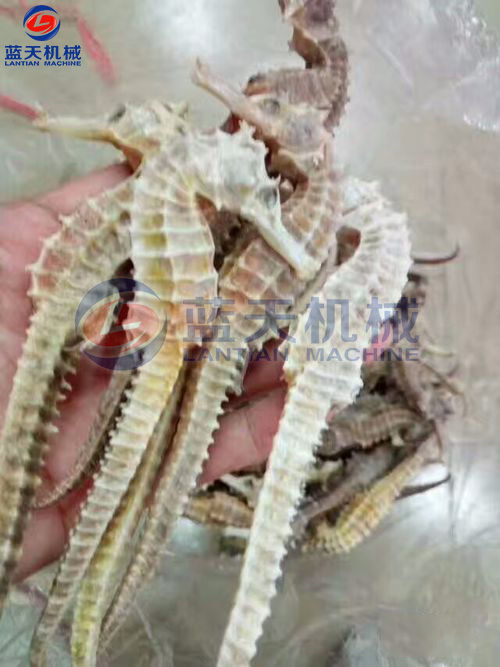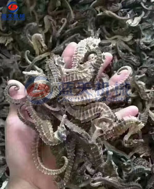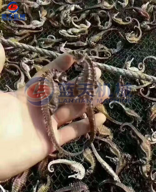 加工時.將海馬放在淡水中,清洗干凈,浸泡一段時間后,洗刷去體表灰黑色的皮膜,剖腹去掉內(nèi)臟,將尾盤卷起,將處理后的海馬平鋪在物料網(wǎng)格盤中,插入物料推車隔層,將裝滿新鮮海馬的物料車推入烘干房,關(guān)閉烘干房密封門。