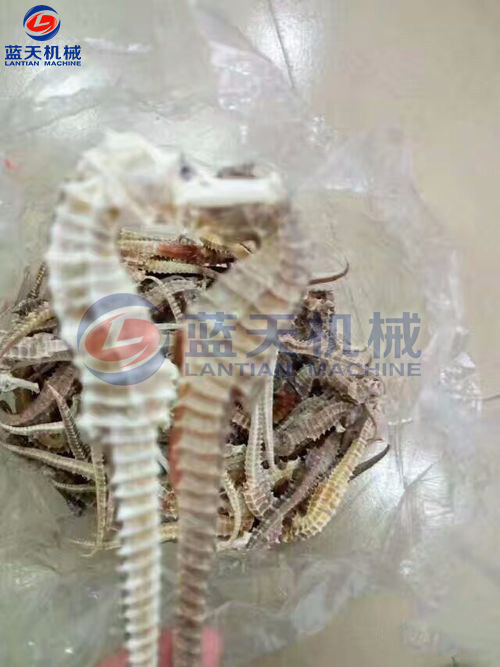 用紅線將雌雄兩只海馬并排捆扎成對,稱為“對馬”、“對海馬”。幼小的海馬烘干之后叫做“海蛆”。烘干后的海馬用干凈的紙包扎好,即為成品,可直接出售或進入塑料袋或瓦罐中,密封貯藏,每隔半個月至1個月檢查一次,防蟲防潮,發(fā)現(xiàn)變質(zhì)的要及時處理。