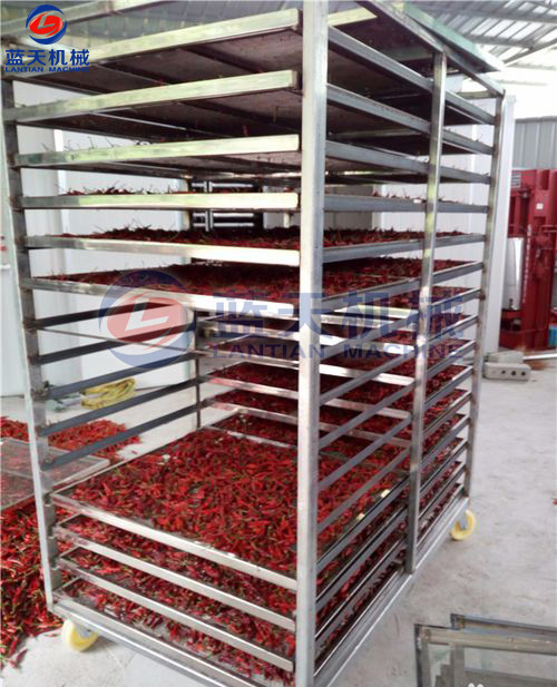 辣椒的堆放厚度:辣椒的堆放厚度力求一至,一般20~30厘米為宜,堆放太薄,透氣性好,風(fēng)阻小,雖然有利于熱交換,但熱空氣與辣椒的接觸時間相對縮短,熱利用率低,若堆放太厚,則阻力增太,熱空氣無法穿透物層,烘干效果較差。