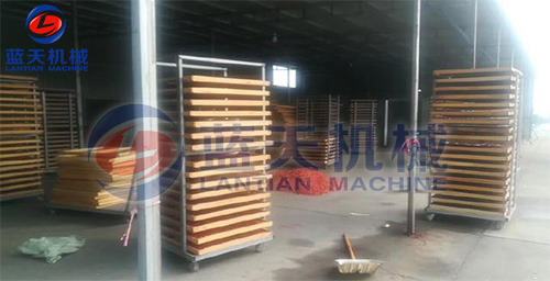 踩堆發(fā)汗:即將含水率75%一85%的辣椒,第一次將辣椒烘干到含水率50%踩堆發(fā)汗,再進(jìn)行第二次烘干。踩堆發(fā)汗在辣椒干燥工藝中是一個很重要的步驟,是否采用這一步驟對辣椒品質(zhì)和烘干時間、都有很大影響。辣椒在烘干過程中都有明顯的軟化和膨脹現(xiàn)象。踩堆發(fā)汗的主要作用是調(diào)質(zhì),使辣椒油向表面滲透,烘干后的辣椒顏色一致,紅潤光滑,并促使辣椒含水率趨于平衡。如不進(jìn)行踩堆發(fā)汗,烘干1000公斤辣椒,熱風(fēng)溫度40℃—60℃時 需時間63小時,踩堆發(fā)汗后則可縮短到40小時左右,且花黃殼顯著減少。