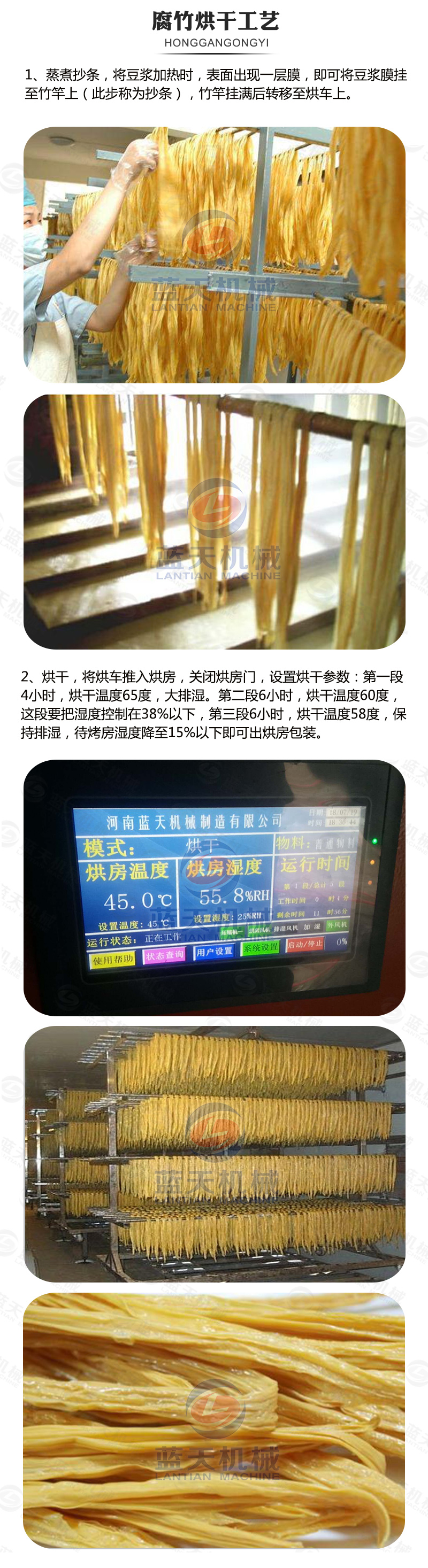 3:腐竹烘干一般經(jīng)歷預(yù)熱50-60℃、高溫烘干大量排濕階段65℃,、恒溫烘干階段60℃,相對(duì)濕度控制在50%以下,待水分降至15%左右,降溫階段,烘干時(shí)間約5小時(shí),含水量約8%左右即可。這樣腐竹烘干機(jī)烘干的腐竹品質(zhì)好,表面的油份和光澤度適當(dāng),不易脆斷,保留了成品的色、香、味、形,且腐竹的損耗小。