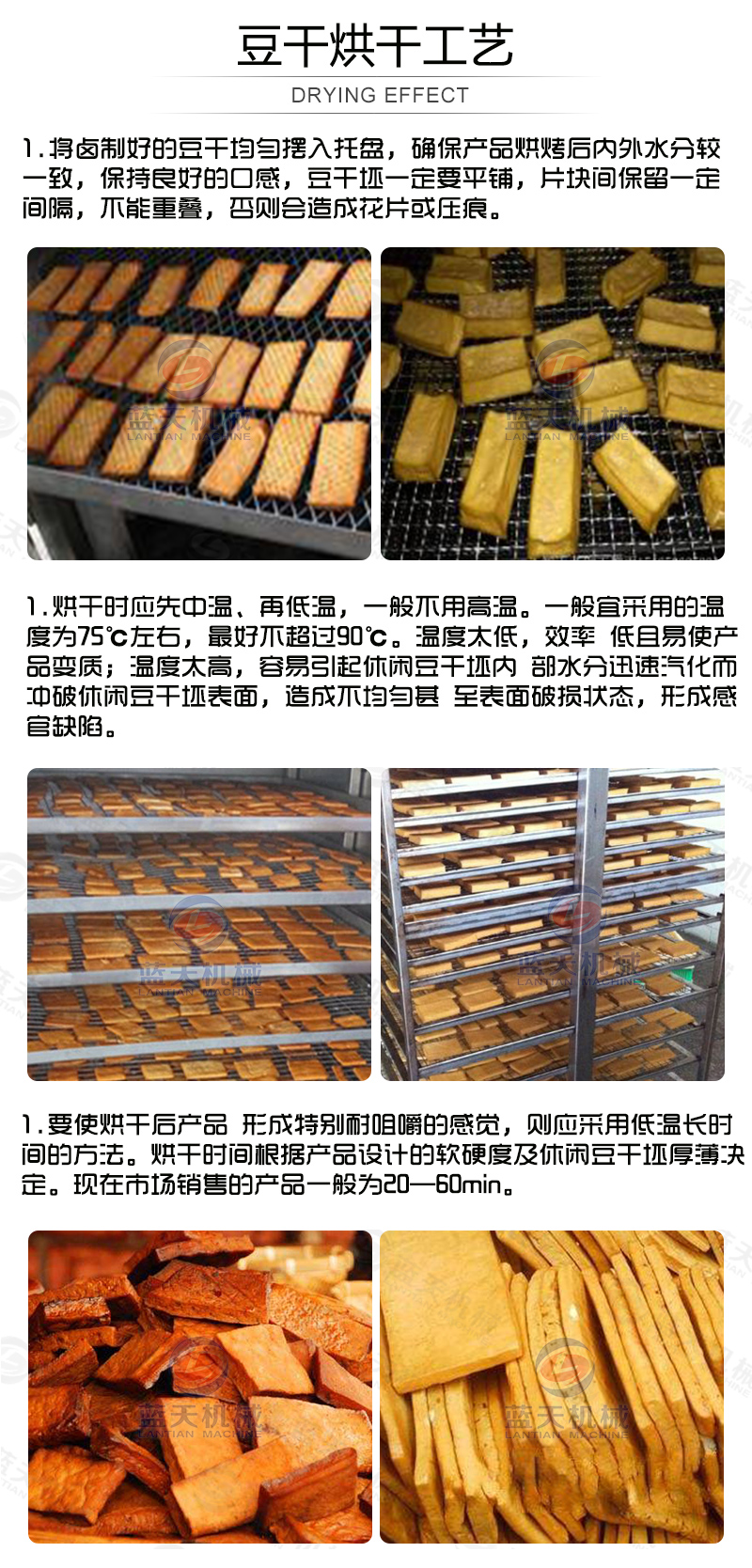 豆腐干坯要平鋪,片塊間保留適當的間隔,不能重疊,否則會造成花片或壓痕。豆腐干烘干時,豆腐干烘干設備應先中溫、再低溫,一般不用高溫。一般豆腐干烘干機宜采用的溫度為85℃左右,不超過95℃。豆腐干烘干設備溫度太低,效率低且易使產品變質;溫度太高,容易引起豆干坯內部水分迅速汽化而沖破豆干坯表面,造成不均勻甚至表面破損狀態,形成感官缺陷。如果要使烘干后豆腐干形成特別耐咀嚼的感覺,豆腐干烘干機則應采用低溫長時間的方法。豆腐干烘干時間根據豆腐干設計的軟硬度及休閑豆干坯厚薄決定。