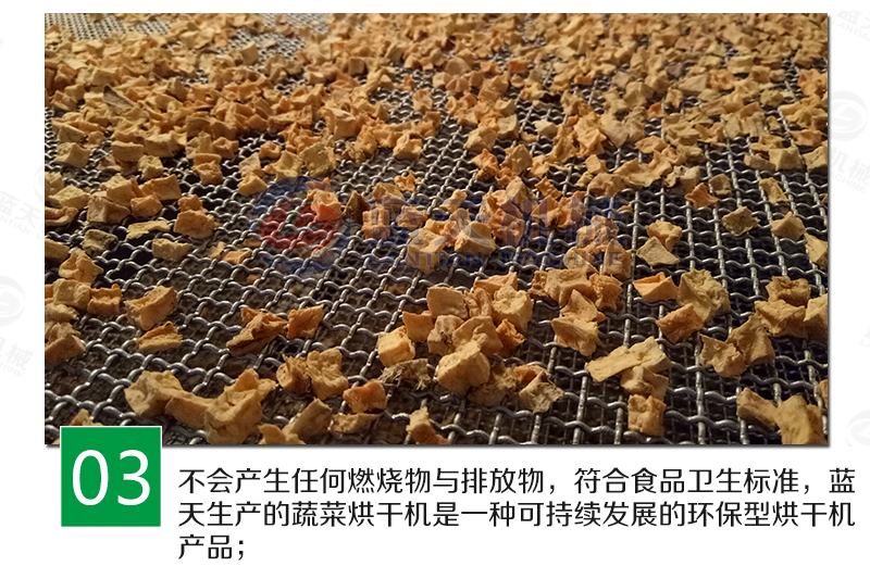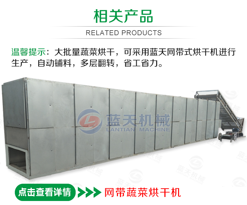 蔬菜烘干機目前有兩個結構:箱式和網帶式。網帶式蔬菜烘干機逐層進行烘干,類似人工翻曬保證物料烘干達到客戶的要求,蔬菜烘干設備自上到下的逐層烘干,每層蔬菜原有的色澤不會出現過大的偏差,同時蔬菜烘干機吹出的熱濕風對蔬菜原有的顏色也有保護作用,以致烘干后的蔬菜顏色漂亮。