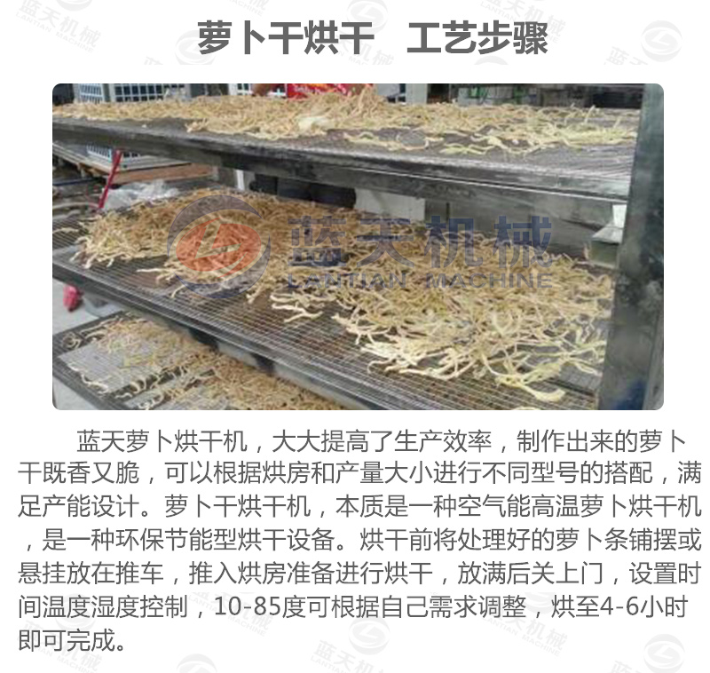 蘿卜干是一種風味、具有悠久歷史的食品。傳統蘿卜干加工采用是風脫水的方法,利用日照和風力,加速蘿卜的蒸騰作用,使蘿卜大量脫水,并利用鹽的高滲透壓來保存。我們介紹一種基于空氣能技術熱風烘干的蘿卜干烘干機代替日曬來加工蘿卜干,加快蘿卜干加工過程。