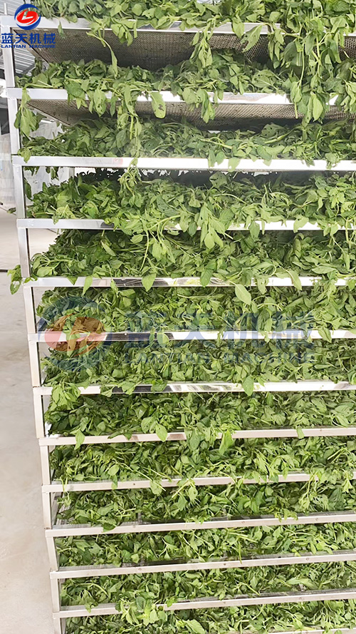 山東蔬菜烘干機客戶購買的是箱式蔬菜烘干機,蔬菜成熟后,工人將蔬菜均勻的攤放在托盤中,放入小推車。進入蔬菜烘干機進行烘干。
